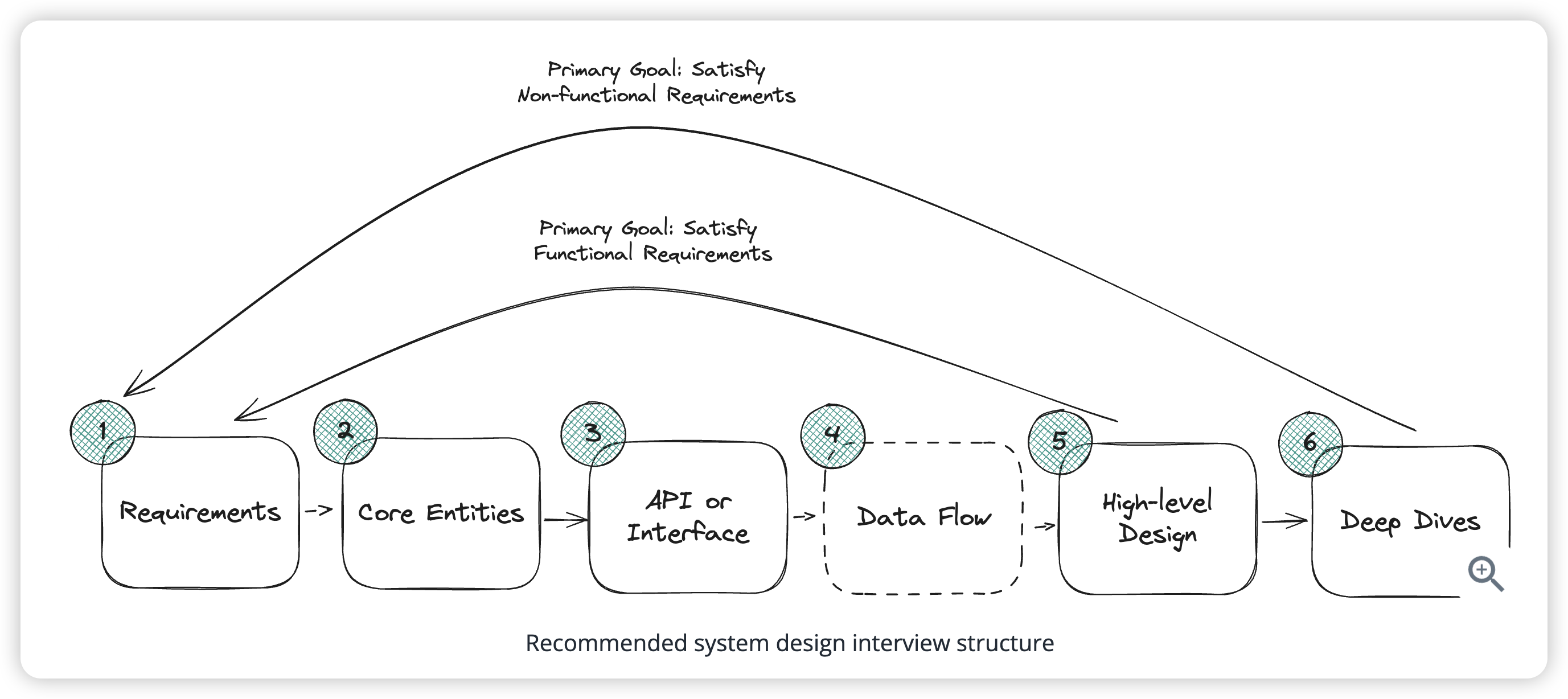 requirement → core entities → API/interface → data flow → high level → deep dive